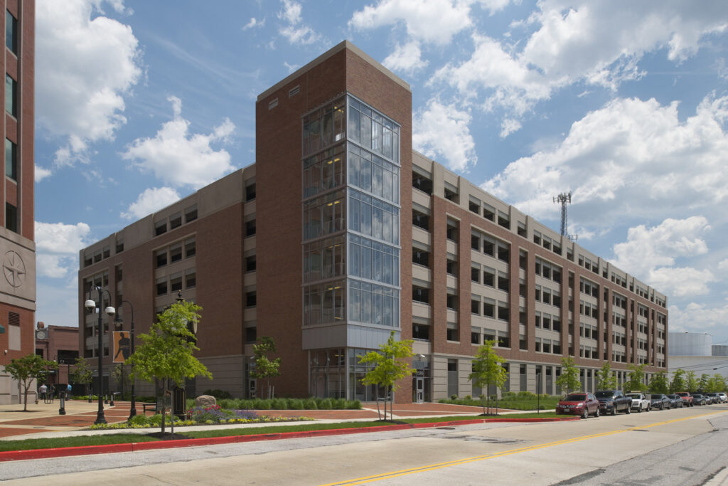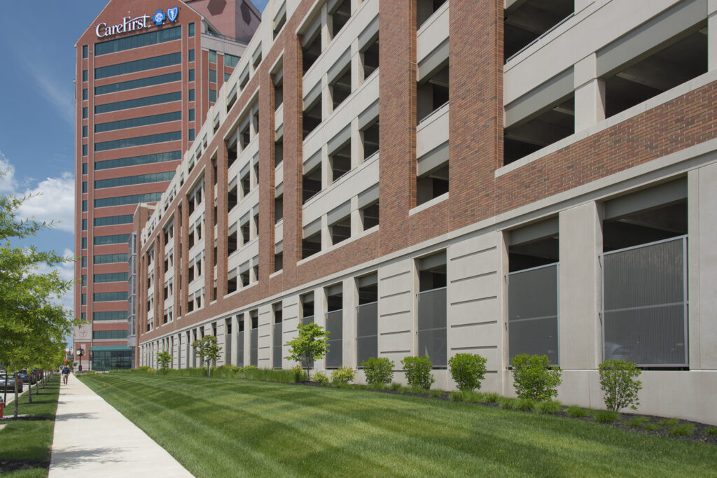The Canton Crossing structure is a 7-level precast parking garage consisting of 1,295 spaces. The structure provides parking for the Canton Crossing Tower, which was formerly known as the First Mariner Bank Building. A cantilevered glass-enclosed stair tower maximized the sidewalk space at grade while providing generous views of the harbor. Access to the parking structure is controlled via an Automatic Vehicle Identification (AVI) System. This project was awarded Baltimore City’s Green Building Standard’s Two Green Star Rating (equivalent to LEED Silver). The parking structure has electric car charging stations, low-fuel emission parking spaces, and handicapped parking on all levels. Stormwater is managed under the ramp of the structure through two large baffled settling pools. Additional sustainable elements include: