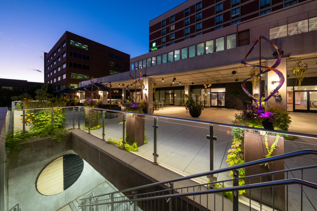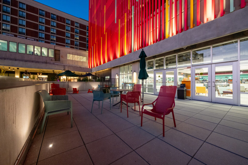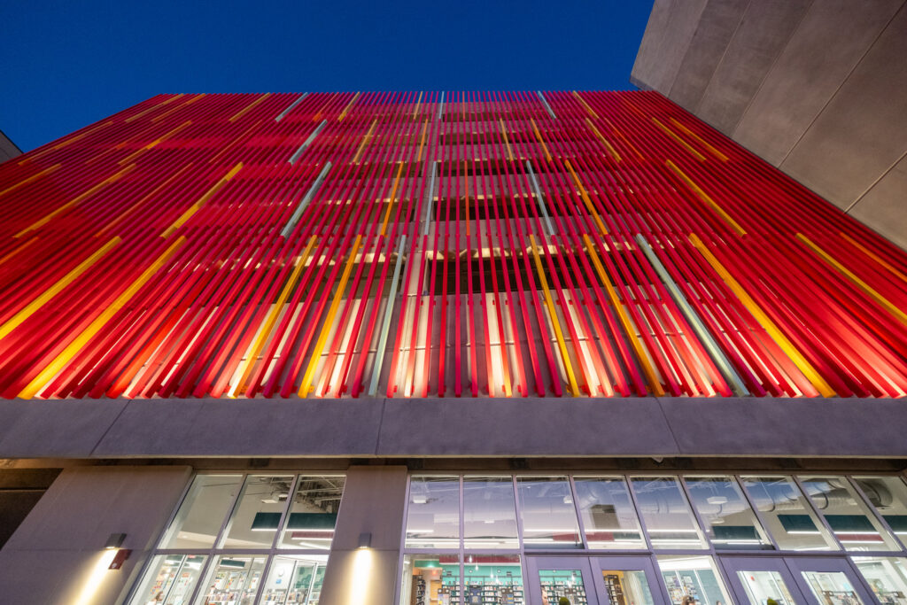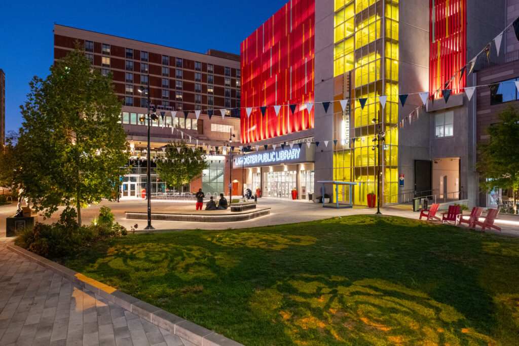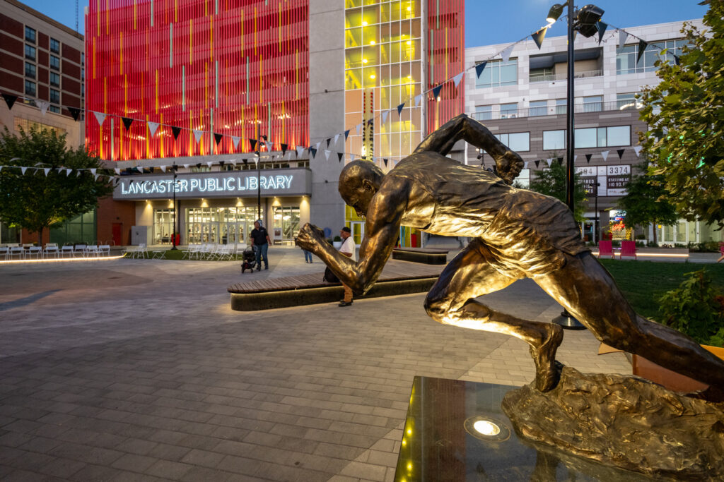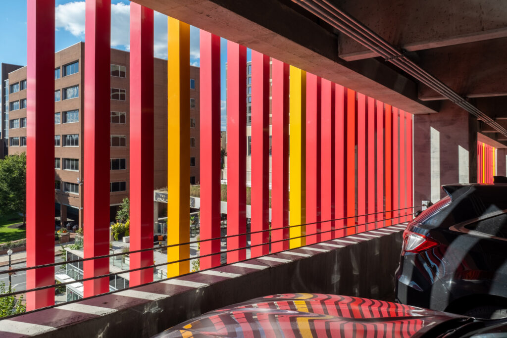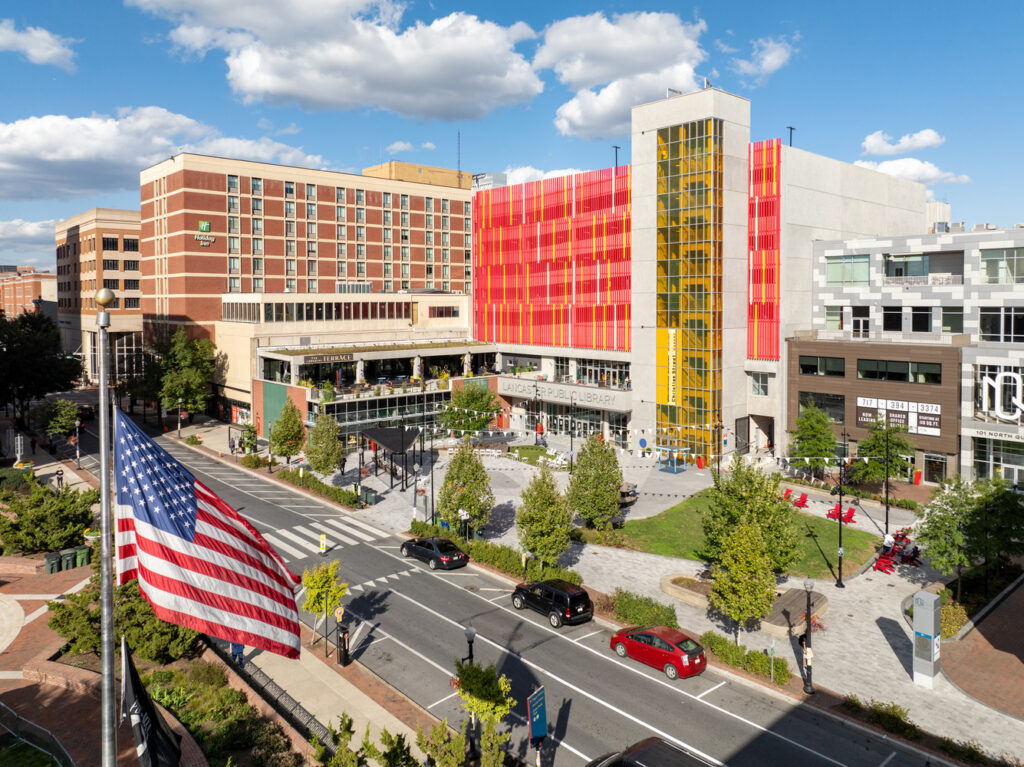 The garage’s facade features the “New Lancaster Rainbow,” a work of public art made from more than 450 polychromatic aluminum tubes. This polychromatic feature pays homage to the legacy of Olympic gold medalist Barney Ewell and represents inclusivity and unity.