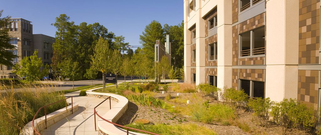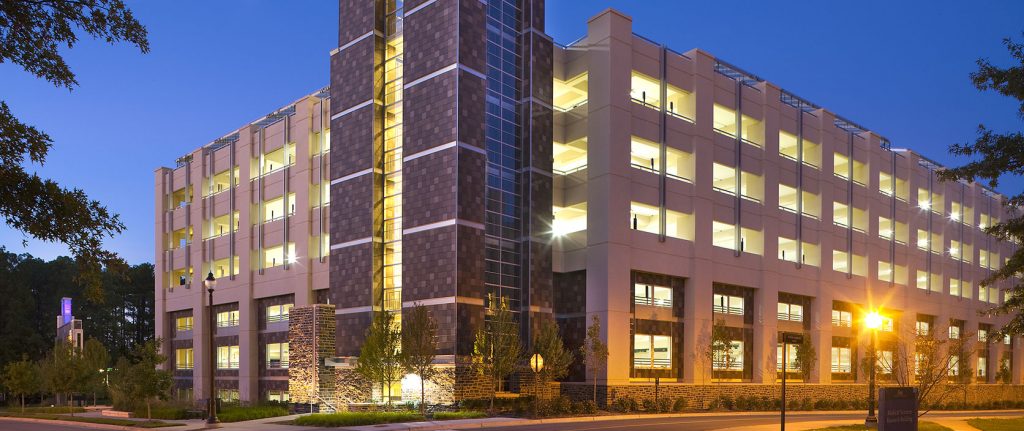 Duke University’s Research Drive Garage is a 1,917 space 7-level cast-in-place post-tensioned concrete parking structure. The stand-alone single-use garage is certified by the US Green Building Council, earning 31 LEED® points. The parking structure is simultaneously sustainable, functional and integrated with the existing campus fabric, using the stonework pattern commonly referred to as “Duke stone”. More than 75% of the site was restored to natural woodland. The facility features a “living” green wall, LED lighting, and rooftop canopies. It supplies much needed parking to the Duke Medical Center campus.