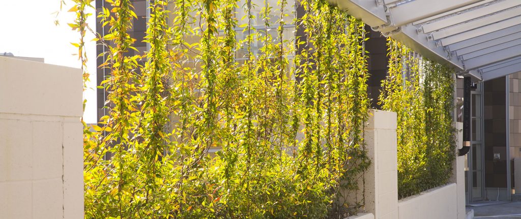 - Green trellis canopies on the roof and green screen exterior walls provide vegetated surfaces to reduce heat-island effect, filter airborne emissions and provide aesthetic appeal.