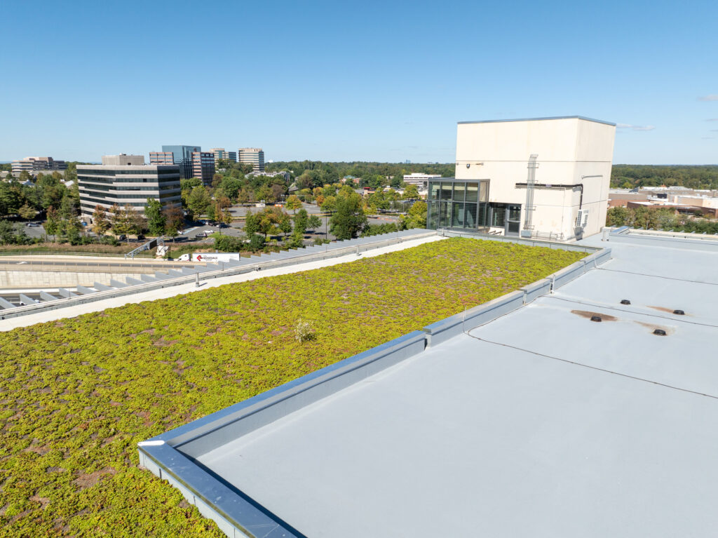 Forty (40) EV Chargers, 85% recycled construction waste, and Capital Bikeshare rental qualify this as a Low-Impact Development (LID) project. LED lighting and occupancy sensors have been utilized to reduce electrical consumption. The green roof at the perimeter has been designed to accommodate the future installation of PV panels. Landscape features include Tree Save along the Government Center Parkway, which uses a low retaining wall system, a rain garden, and native and non-invasive species.