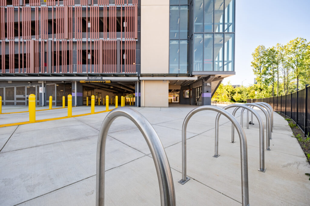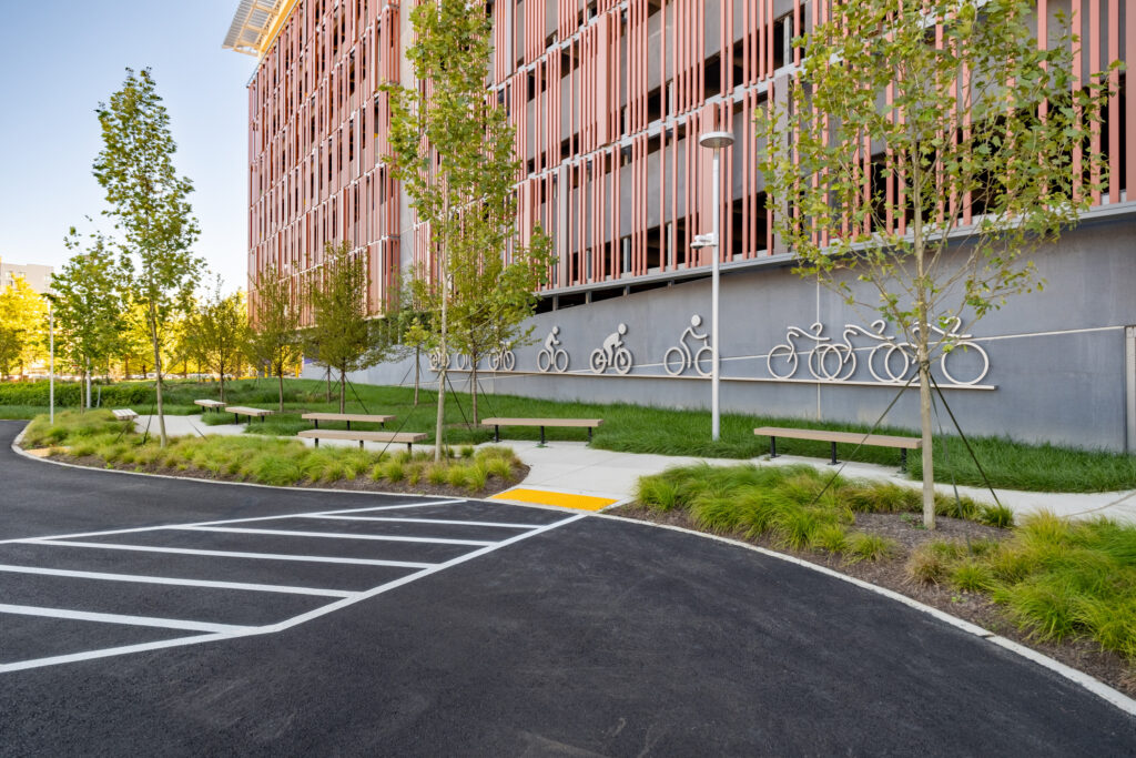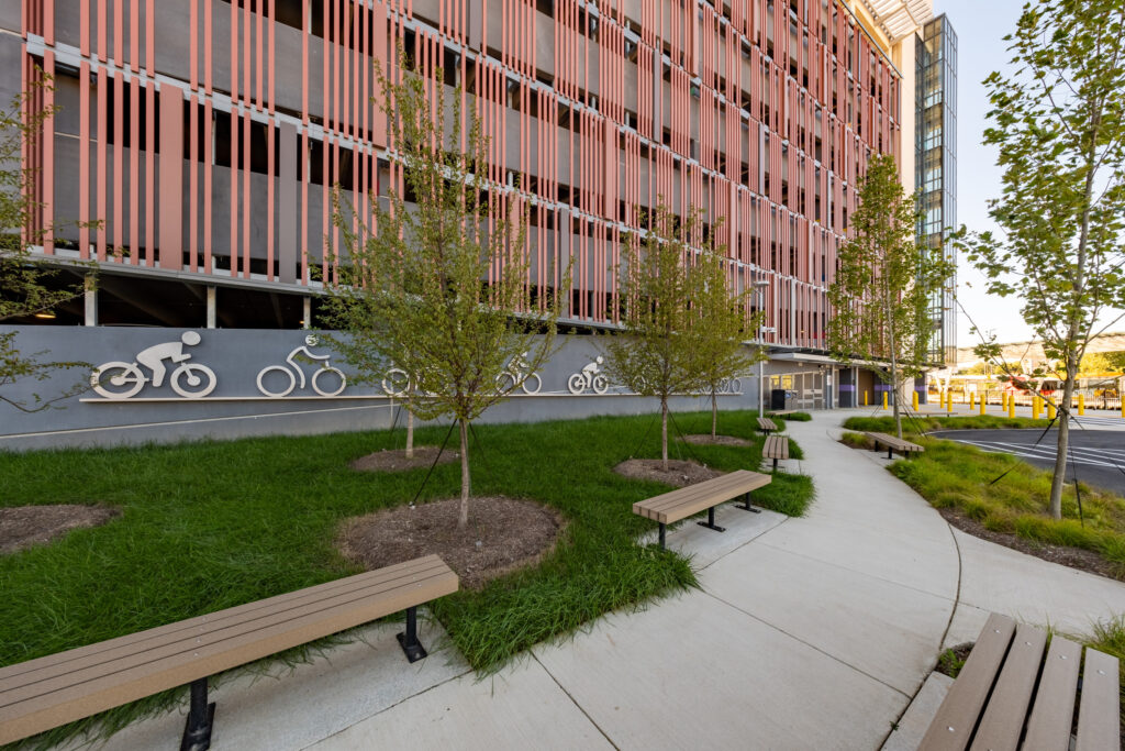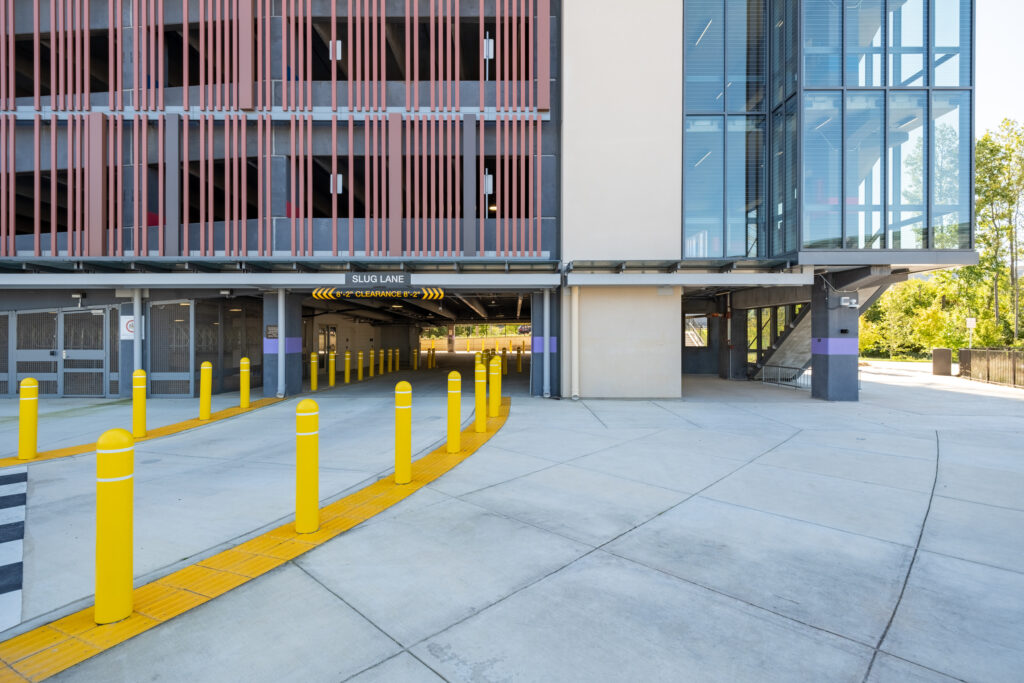 The facility supports the safety of the community by providing a Pedestrian Safe Zone with high-visibility crosswalks and bollards. Other safety features include pedestrian canopies, pickup/drop-off areas, and ride-share lanes.