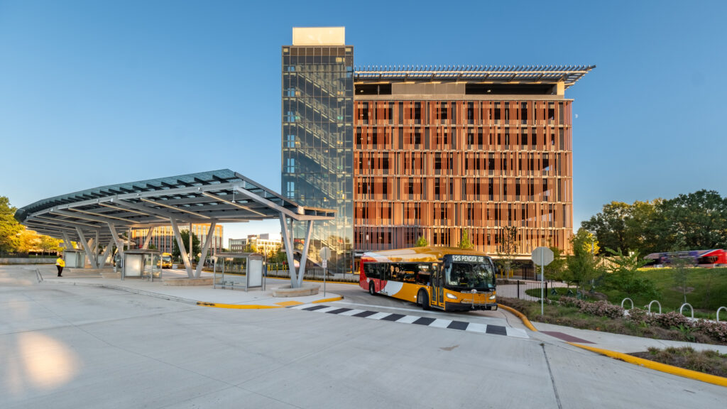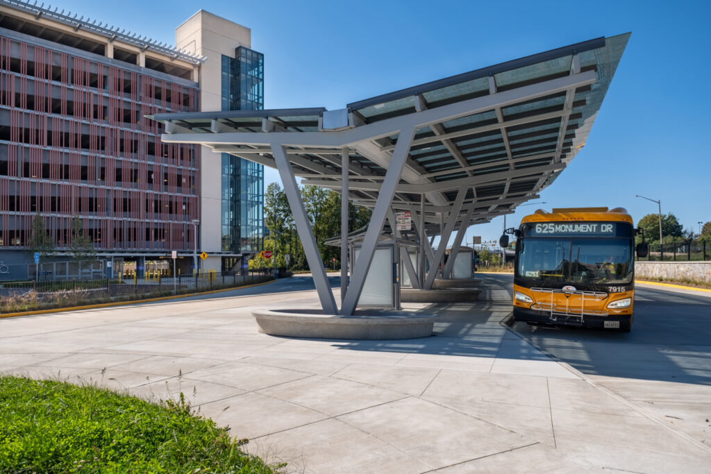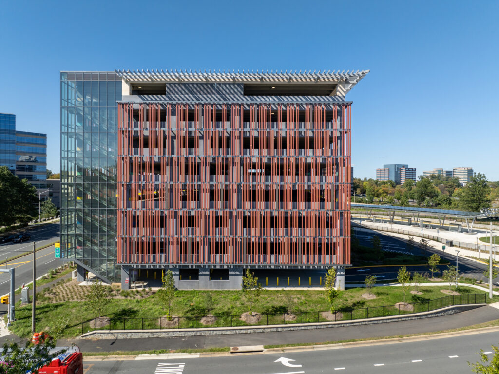 The Fairfax Monument Drive Parking Garage and Transit Center is a 261,660 SF, eight (8)-level, 820-stall pre-cast parking garage. Constructed of pre-cast concrete and clad with an aluminum tube cladding system, the facade maintains “openness” without compromising the desired aesthetic of the structure. At night, the earth-tone terracotta facade and glass canopy are illuminated by architectural lighting. The garage provides enhanced commuting options for Fair Oaks Mall, Fairfax Coner, and County Government Complex employees and residents.