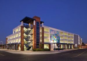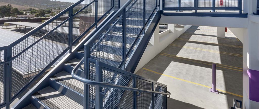 The parking structure was constructed with embed plates at the roof level that will accommodate the future addition of a PV panel canopy structure. Electrical service and conduit infrastructure is also provided for the future installation of ground level electric vehicle charging stations and the rooftop solar panels.