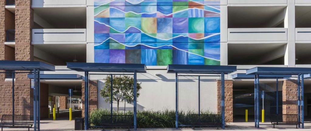 Glass back elevator and open stairs with mesh panel guardrails provide further color and texture accents to the building’s mass. Six large concrete shearwalls provide a backdrop for landscaped green screens and two painted murals. The murals were commissioned in 2013 as part of a public arts initiative, was created to evoke the many days, seasons and colors of the San Gabriel and Pomona valleys.