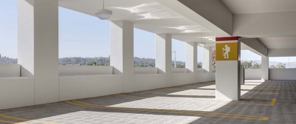 The parking structure is a 5-level, post-tensioned concrete structure with 622 total parking stalls. Foothill Transit customers using the new state of the-art structure will enjoy 422 dedicated park & ride spaces, while the remaining parking spaces will be reserved for Metrolink riders. Foothill Transit buses stop just outside of the parking structure, directly adjacent to a stair and elevator lobby.