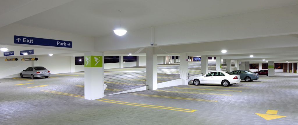 The new parking structure, with its distinctive “kinked” shape, was designed to fit within the geometry of the existing surface parking lot. The parking structure has 2 bays with two-way 90 degree parking. Vehicles enter the parking structure on the east side of the structure and exit from the west side joining with the existing traffic flow through the surface parking lot. Long span construction with 18 foot column spacing was used to maximize construction efficiency and enhance the openness of the parking structure.