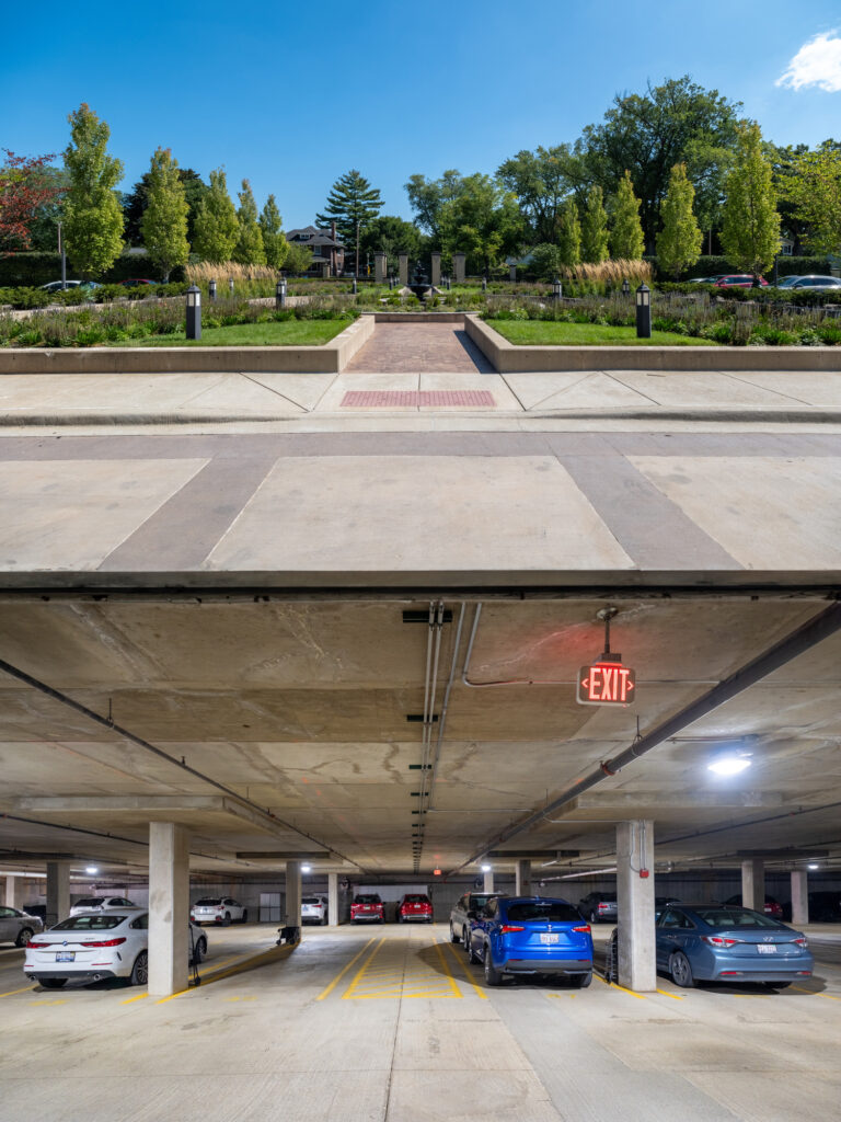 Walker’s condition assessment included visual reviews, nondestructive testing to identify the as-constructed slab reinforcement, structural analysis, and openings in the concrete topping slab and landscaping to review the existing buried waterproofing system condition.
