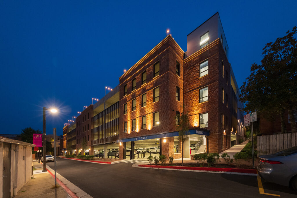 The architectural design was shaped through on-going interactions with downtown businesses, downtown residents, and the community at large, which all embraced the architecturally-sensitive design of the garage. The architect designed a brick portal system to help break down the scale to pedestrian-friendly intervals. Brick was selected with qualities to complement the existing buildings around the site and masonry details that blend with the historic character of Annapolis. Punched window openings in the brick façades also help to ease the scale of the relatively large building. The spaces between the brick portals were treated with a vertical slat system to help keep the desired openness but to obscure the direct views of the concrete structure. These slats also help reduce stray light from headlights in the evening.