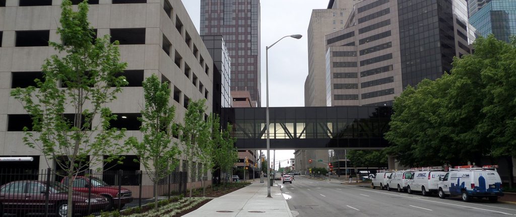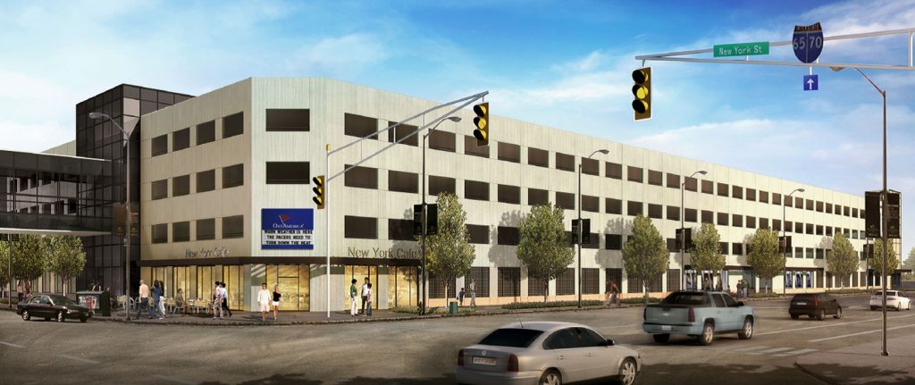 Automatic Vehicle Identification (AVI) parking access equipment will minimize the time spent entering and exiting the facility. A parking availability display system will direct patrons to open spaces. A pedestrian bridge will connect the garage to the OneAmerica tower across New York Street.