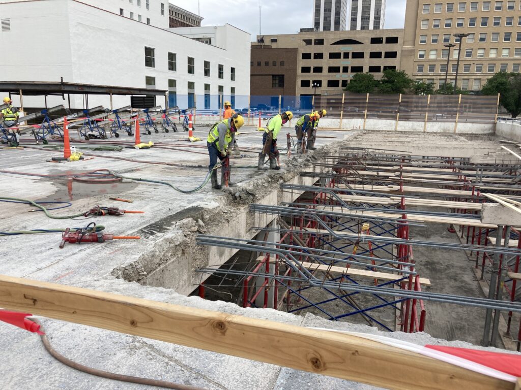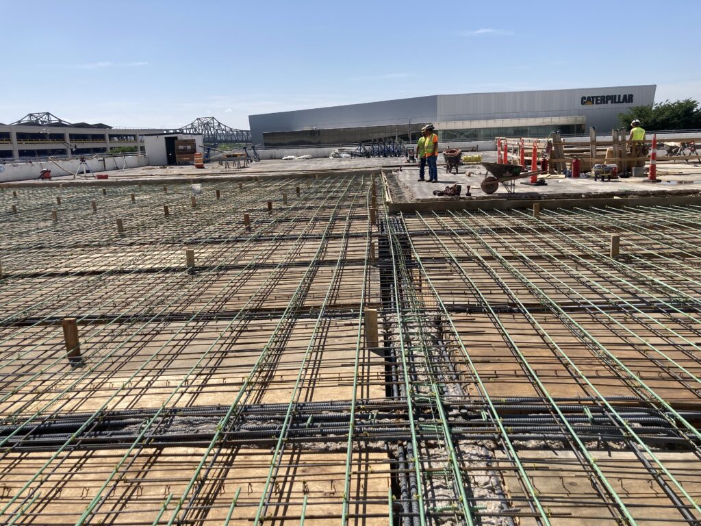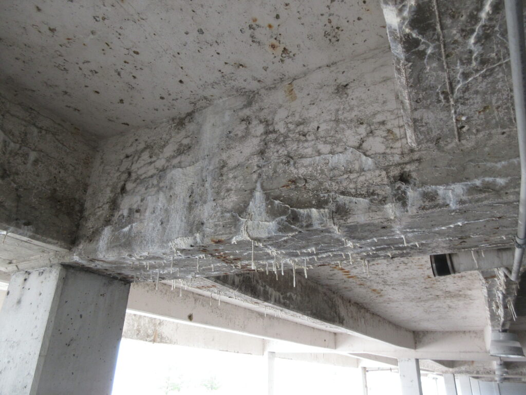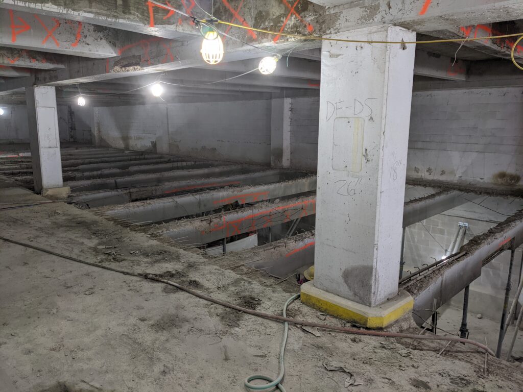 The historic parking structure was originally constructed in 1950. It is 4 levels and 145,000 square feet with one partial below-grade and one level below grade. Between the parking structure and adjacent building is an integrally constructed finished pavilion space. The parking structure is part of a historically registered district connecting to the adjacent 1920 historically registered office building. The structure had previously undergone several repair programs, the last completed many years ago. As a result, the structure was severely deteriorated and in a state of disrepair. Due to safety concerns, the structure had been closed for many years. However, after completing renovation of the adjacent connected office building, the Owner’s attention turned to the parking structure. The owner engaged Walker to perform a condition assessment of the structure to evaluate the deterioration and provide repair options. Walker performed a complete condition assessment of the structure that included visual observations and soundings to record findings, estimate repair quantities, and provide repair options. The team used Ground Penetrating Radar (GPR) and test openings to document existing reinforcement in structural members. Soil test pits and soil borings were performed to determine geotechnic properties of the surrounding soils to evaluate repair options. The assessment found the structure to be in poor condition with over 90% of the roof level beams exhibiting severe freeze-thaw deterioration, an estimated 50% of lower-level beams exhibiting areas of corrosion related distress, and over 50% of the total elevated floor slab areas exhibited corrosion related distress. After performing the condition assessment, Walker provided the owner with several repair solutions and the owner chose to perform a complete restoration of the parking structure and pavilion area. Walker provided the designs for repairs which included gaining approval for the designs from the State Preservation Office and National Parks Services. Walker provided repair designs which included: