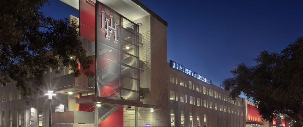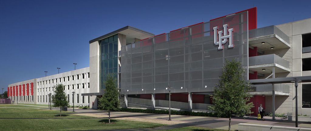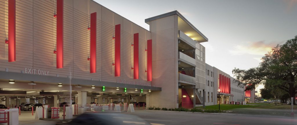 The Stadium Parking Garage supplies approximately 2,300 total parking spaces on 4-levels with segregated parking areas for visitors, faculty/staff, and students at the University of Houston. Each parking area is provided with an independent vehicular entry and exit while incorporating University golf cart spaces, car charging stations, and motorcycle spaces.