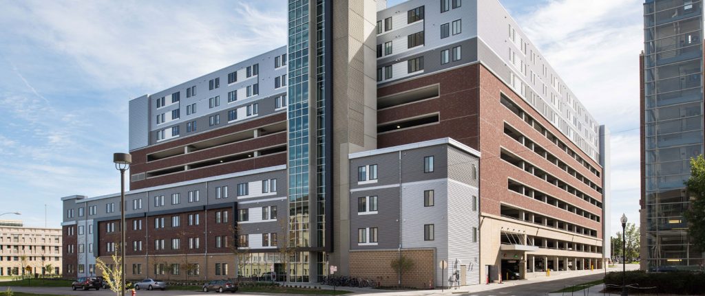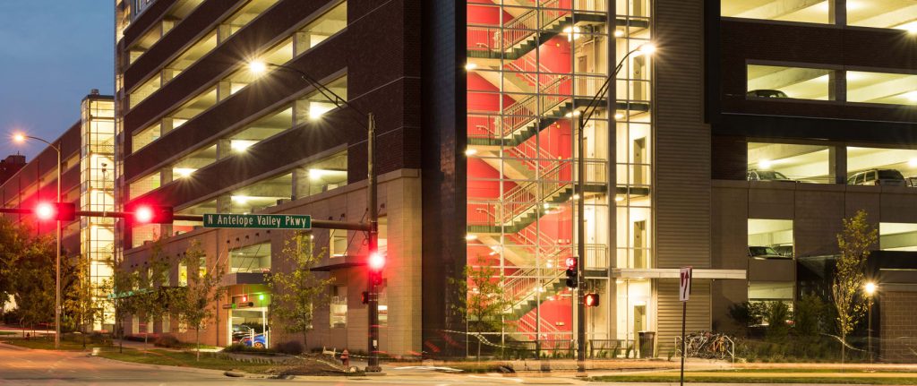 Walker provided functional design/parking consulting and structural engineering of 1,608 space parking structure utilizing the design-build project delivery system and serving mixed uses. A Public/Private partnership between the University of Nebraska and private residential developer enabled a mixed-use structure to be built to support the growing University of Lincoln population. The development includes 7 levels of student apartment-style housing providing housing for 476 people and contains a courtyard and rooftop common areas, fitness center, and on-site management office.
